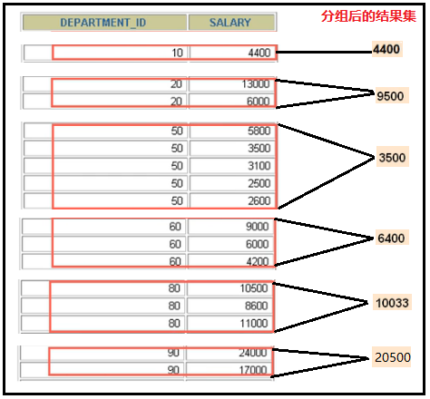 可以清楚地看到,使用department_id進行分組后,系統(tǒng)默認(rèn)將department_id相同的號所在的行,分配在一起,你有幾個不同的department_id,就會分為幾組,每個組中的數(shù)據(jù)行數(shù),不一定都要相同。