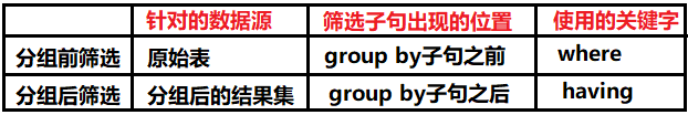 只要是需求中,涉及到聚合函數(shù)做條件的情況,一定是分組后的篩選。能用分組前篩選的,就優(yōu)先考慮分組前的篩選。(考慮到性能問題)