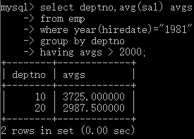 習(xí)題:查詢1981年入職的,不同部門間工資的平均值大于2000的部門編號和平均值。