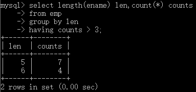 習(xí)題:按員工姓名的長度分組,查詢每一組的員工個數(shù),篩選員工個數(shù)>3的有哪些?