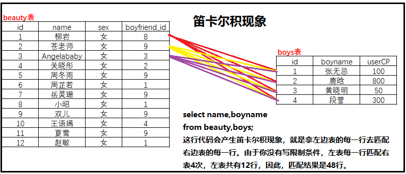 如果不想產(chǎn)生笛卡爾積現(xiàn)象,就需要添加有效的表連接條件。拿上述例子來說,左表boyfriend_id只有和右邊id相等時,才代表她們的男朋友。