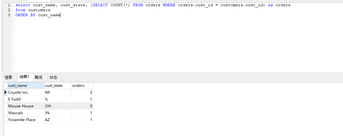 select cust_name, cust_state, (SELECT COUNT(*) FROM orders WHERE orders.cust_id = customers.cust_id) as orders from customers ORDER BY cust_name