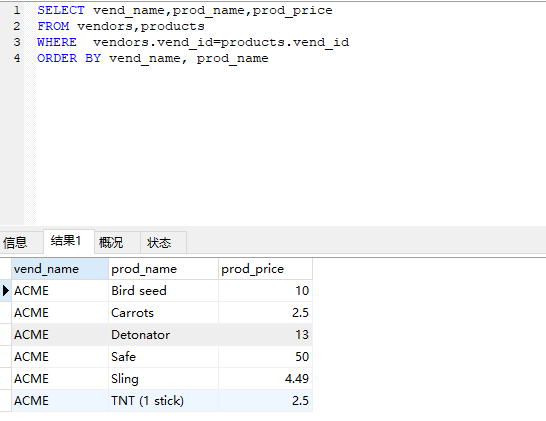 SELECT vend_name,prod_name,prod_price FROM vendors,products WHERE vendors.vend_id=products.vend_id ORDER BY vend_name, prod_name