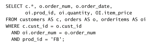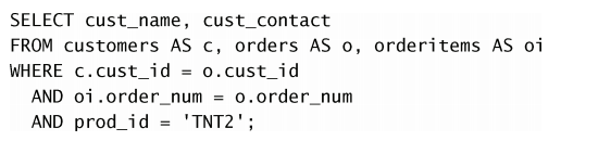 select cust_id from orders where order_num IN (SELECT order_num from orderitems where prod_id = 'TNT2' )