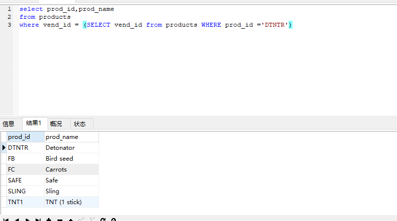 select prod_id,prod_name from products where vend_id = (SELECT vend_id from products WHERE prod_id ='DTNTR')