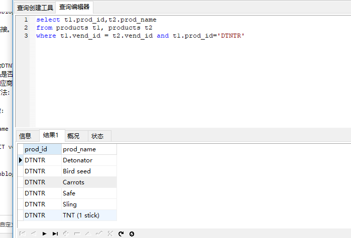select t1.prod_id,t2.prod_name from products t1, products t2 where t1.vend_id = t2.vend_id and t1.prod_id='DTNTR'