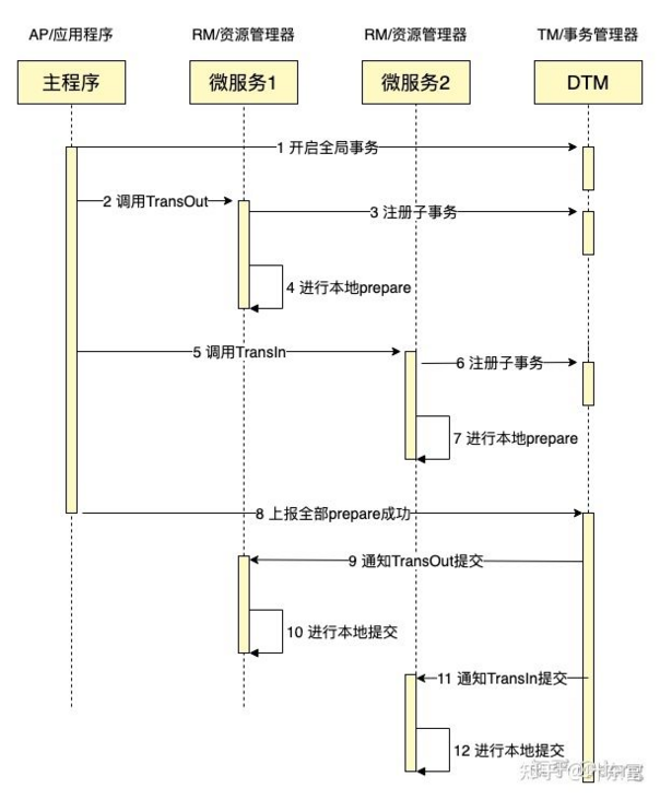 把上面的轉(zhuǎn)賬作為例子,一個成功完成的XA事務時序圖如下: