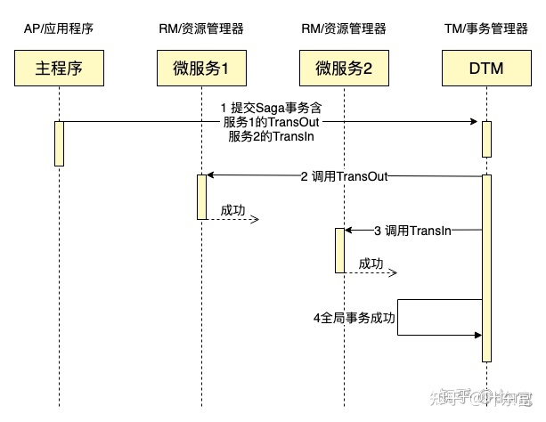 把上面的轉(zhuǎn)賬作為例子,一個成功完成的SAGA事務時序圖如下: