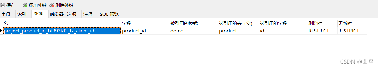 現(xiàn)在我們在數(shù)據(jù)庫中建立了兩張表:【product和project】,【project】的porduct字段,關聯(lián)Product,他們之間存在下圖這樣的一條外鍵記錄: