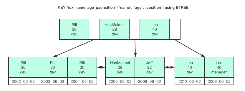 where name = 'Jeff' and age = 22 -- 命中索引 where age = 30 and postatin='manager' -- 不命中索引 where postation = 'dev'-- 不命中索引
