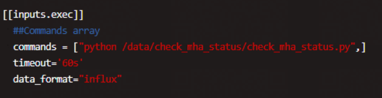 [[inputs.exec]] ##Commands array commands = ["python /data/check_mha_status/check_mha_status.py",] timeout='60s' data_format="influx"