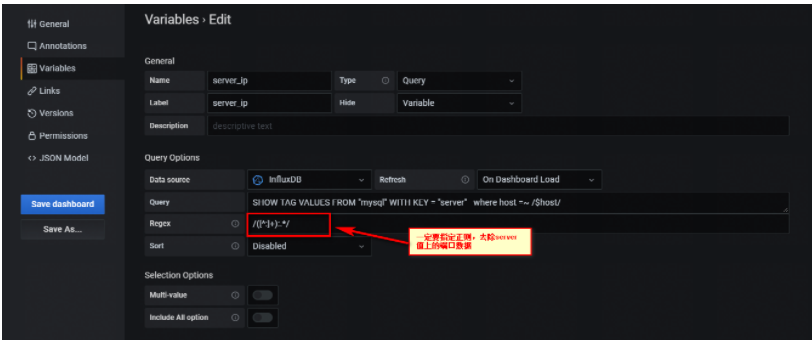 首先,將instance(Server IP:端口) 正則下,去除端口數(shù)據(jù),實(shí)現(xiàn)方式,增加一個grafana變量--server_ip,如下:
