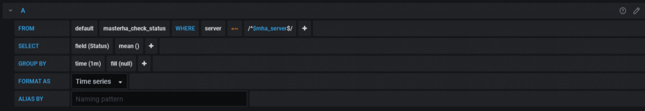 SELECT mean("Status") FROM "masterha_check_status" WHERE ("server" =~ /^$mha_server$/) AND $timeFilter GROUP BY time(1m) fill(null)