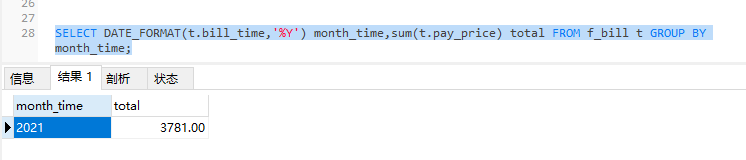 SELECT DATE_FORMAT(t.bill_time,'%Y') month_time,sum(t.pay_price) total FROM f_bill t GROUP BY month_time;