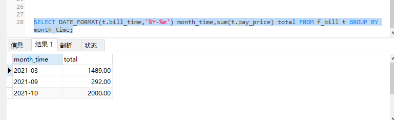 SELECT DATE_FORMAT(t.bill_time,'%Y-%m') month_time,sum(t.pay_price) total FROM f_bill t GROUP BY month_time;