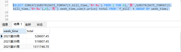 SELECT CONCAT(SUBSTR(DATE_FORMAT(t.bill_time,'%Y-%u') FROM 1 FOR 4),'第',SUBSTR(DATE_FORMAT(t.bill_time,'%Y-%u'),6),'周') week_time,sum(t.price) total FROM f_bill t GROUP BY week_time;