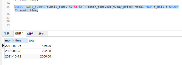 SELECT DATE_FORMAT(t.bill_time,'%Y-%m-%d') month_time,sum(t.pay_price) total FROM f_bill t GROUP BY month_time;