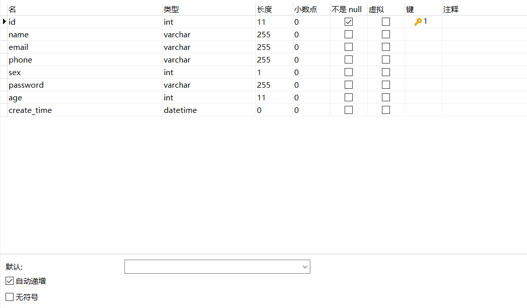 2.創(chuàng)建測試表 user,懶得寫語句 反正每個人需要的表不一樣