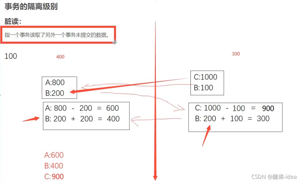 臟讀(DIrty read) :當(dāng)一個事務(wù)正在訪問數(shù)據(jù)并且對數(shù)據(jù)進行了修改,而這種修改還沒有提交到數(shù)據(jù)庫中,這時另外一個事務(wù)也訪問了這個數(shù)據(jù),然后使用了這個數(shù)據(jù)。因為這個數(shù)據(jù)是還沒有提交的數(shù)據(jù),那么另外一個事務(wù)讀到的這個數(shù)據(jù)是"臟數(shù)據(jù)",依據(jù)"臟數(shù)據(jù)"所做的操作可能是不正確的。
