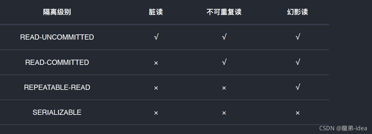 READ-UNCOMMITTED(讀取未提交):最低的隔離級別,允許讀取尚未提交的數(shù)據(jù)變更,可能會導(dǎo)致臟讀、幻讀或不可重復(fù)讀。