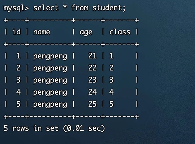 INSERT INTO `student` (`name`, `age`, `class`) VALUES ('pengpeng', 25, '5');