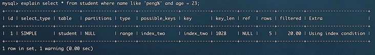 可以看到Extra字段顯示為USING INDEX CONDITION,這就表明這個(gè)SQL使用了索引下推,我們分析下上面這個(gè)SQL語句: