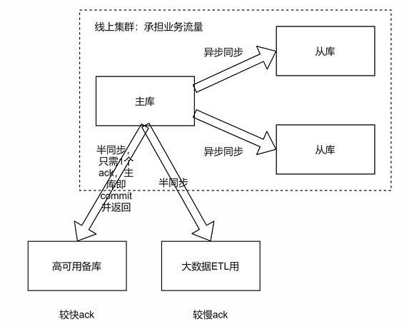 大數(shù)據(jù)取數(shù)可能導(dǎo)致從庫cpu使用率飆升、ack變慢,可設(shè)置半同步所需ack數(shù)量為1,正常情況下高可用備份能很快ack,于是主庫會commit并返回,而大數(shù)據(jù)取數(shù)復(fù)制慢一些也無所謂。這樣就不會因?yàn)榇髷?shù)據(jù)取數(shù)ack慢而影響主庫和業(yè)務(wù)了。
