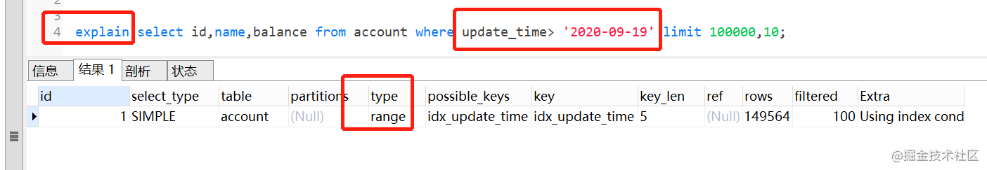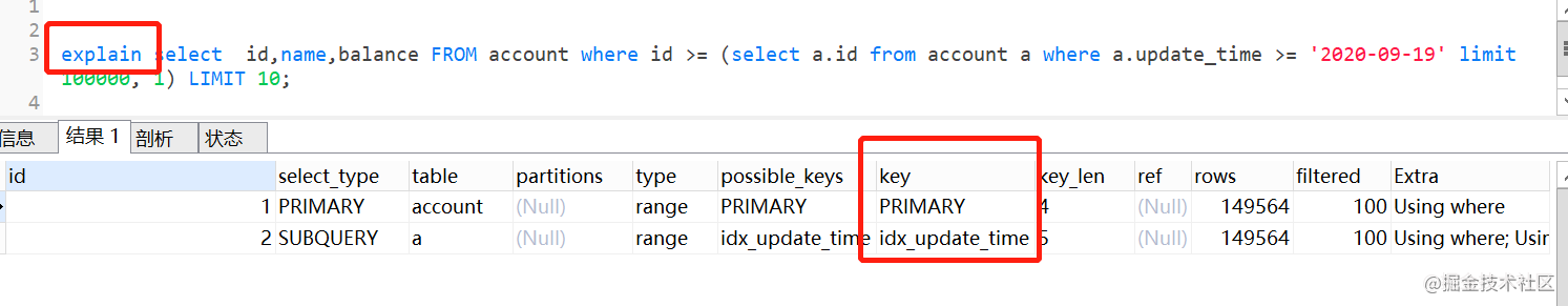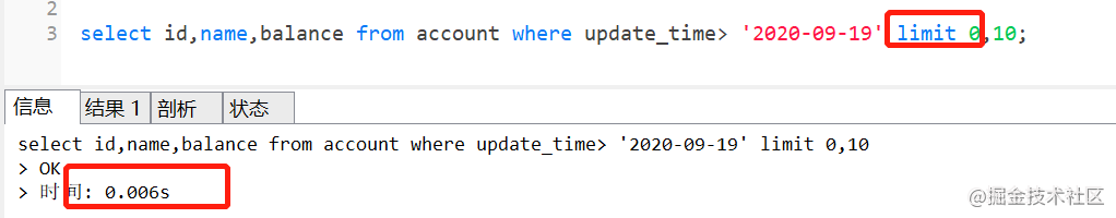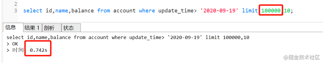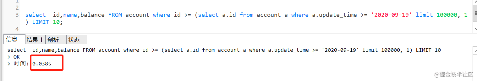 selectid,name,balanceFROMaccountwhereid>=(selecta.idfromaccountawherea.update_time>='2020-09-19'limit100000,1)LIMIT10;