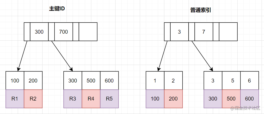 - 二級(jí)索引,葉子節(jié)點(diǎn)存放的是主鍵的值。
