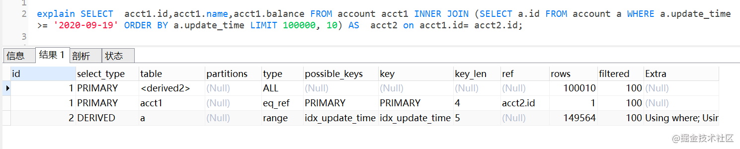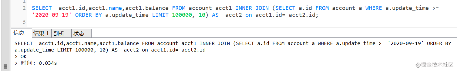 SELECTacct1.id,acct1.name,acct1.balanceFROMaccountacct1INNERJOIN(SELECTa.idFROMaccountaWHEREa.update_time>='2020-09-19'ORDERBYa.update_timeLIMIT100000,10)ASacct2onacct1.id=acct2.id;