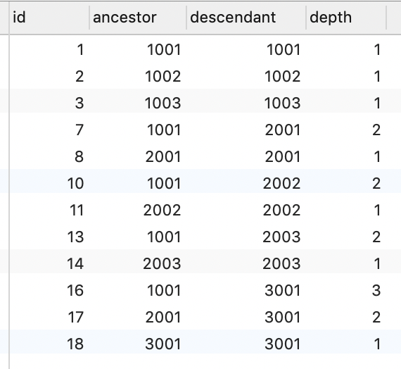 CREATE TABLE `dept_tree_path_info` ( `id` int(10) unsigned NOT NULL AUTO_INCREMENT COMMENT '自增主鍵', `ancestor` int(10) NOT NULL COMMENT '祖先id', `descendant` int(10) NOT NULL COMMENT '后代id', `depth` tinyint(4) NOT NULL DEFAULT '0' COMMENT '層級深度', PRIMARY KEY (`id`) USING BTREE ) ENGINE=InnoDB AUTO_INCREMENT=1 DEFAULT CHARSET=utf8;