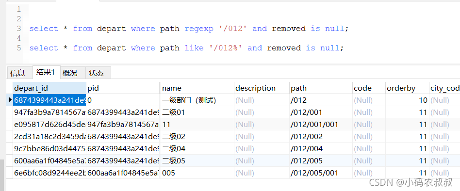 但是有了path字段之后,我們可以直接利用mysql的正則表達(dá)式函數(shù),,仍以上面的數(shù)據(jù)為例,通過下面的這兩種sql,一次性的可以將一級部門(測試)這條數(shù)據(jù)的所有子集數(shù)據(jù)全部查出來,這樣一來,可以說大大減少了與數(shù)據(jù)庫的交互次數(shù)