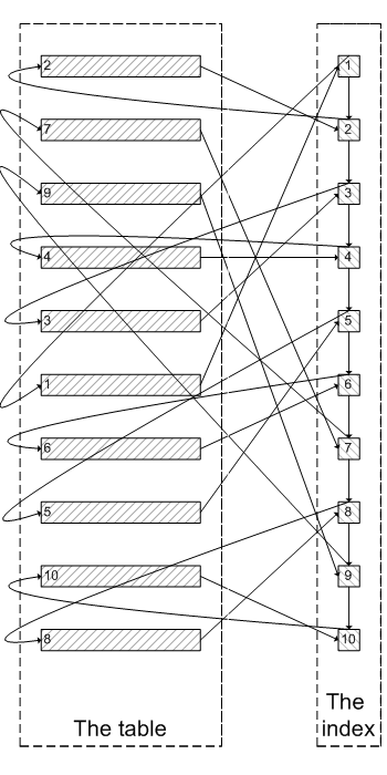 肯定會(huì)有人問:既然一開始是利用索引的,為什么不先沿著索引葉子節(jié)點(diǎn)查詢到最后需要的5個(gè)節(jié)點(diǎn),然后再去聚簇索引中查詢實(shí)際數(shù)據(jù)。這樣只需要5次隨機(jī)I/O,類似于下面圖片的過程: