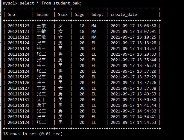 | Sno | Sname | Ssex | Sage | Sdept | create_date |