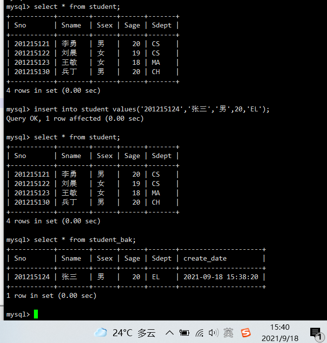drop trigger if exists test_trigger; DELIMITER $ CREATE TRIGGER test_trigger AFTER INSERT ON student2 FOR EACH ROW BEGIN insert into student_bak(Sno,Sname,Ssex,Sage,Sdept) select * from student where Sdept='EL'; delete from student where Sdept='EL'; END $ DELIMITER ;