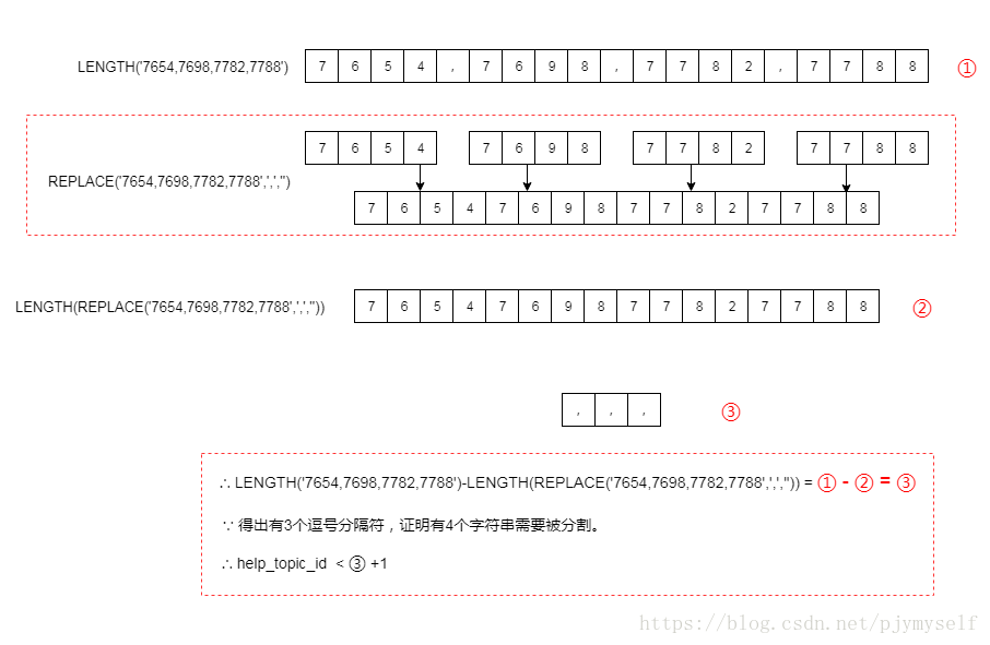 根據(jù)第一步,當(dāng) help_topic_id = 1時(shí),獲取到的字符串 = 7654,7698,此時(shí)第二步截取的字符串 = 7698