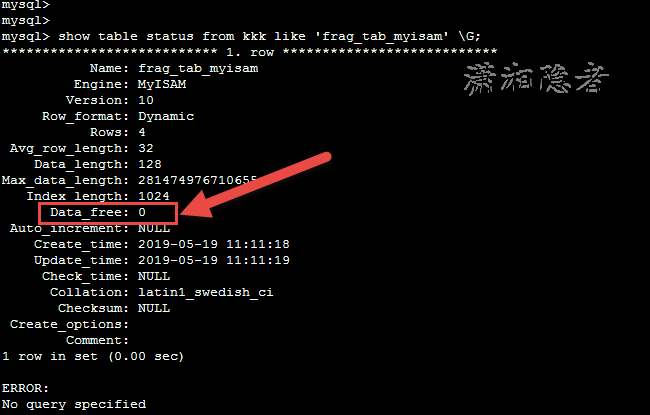 mysql> show table status from kkk like 'frag_tab_myisam' \G;