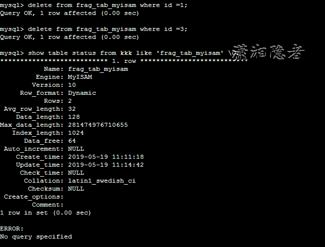 mysql> delete from frag_tab_myisam where id =1; Query OK, 1 row affected (0.00 sec) mysql> delete from frag_tab_myisam where id =3; Query OK, 1 row affected (0.00 sec)