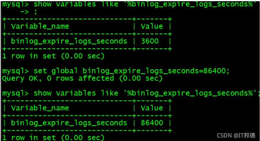 mysql>show variables like '%expire_logs_days%'; --mysql 5.7 mysql> show variables like '%binlog_expire_logs_seconds%' --mysql8.0 mysql8.0 mysql 8開始 expire_logs_days 廢棄 啟用binlog_expire_logs_seconds設(shè)置binlog自動(dòng)清除日志時(shí)間 保存時(shí)間 以秒為單位;默認(rèn)2592000 30天 14400 4小時(shí);86400 1天;259200 3天; mysql> set global binlog_expire_logs_seconds=86400; mysql5.7 這個(gè)默認(rèn)是0,也就是logs不過期,可通過設(shè)置全局的參數(shù),使他臨時(shí)生效: mysql>set global expire_logs_days=10;