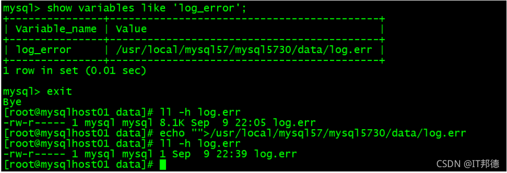 步驟一 查看error日志位置 mysql>show variables like 'log_error'; 步驟二 查看error日志大小 [root@mysqlhost01 data]# ll -h log.err 步驟三 清空error日志 echo "">/usr/local/mysql57/mysql5730/data/log.err