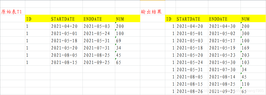 # 文本版 #T1 seq id startdate enddate num 1 1 2021-04-20 2021-05-03 200 2 1 2021-05-01 2021-05-24 100 3 1 2021-05-18 2021-05-31 69 4 1 2021-05-20 2021-07-31 34 5 1 2021-08-05 2021-08-25 45 6 1 2021-08-15 2021-09-25 65 #輸出結(jié)果 ID STARTDATE ENDDATE NUM 1 2021-04-20 2021-04-30 200 1 2021-05-01 2021-05-02 300 1 2021-05-03 2021-05-17 100 1 2021-05-18 2021-05-19 169 1 2021-05-20 2021-05-23 203 1 2021-05-24 2021-05-30 103 1 2021-05-31 2021-07-30 34 1 2021-08-05 2021-08-14 45 1 2021-08-15 2021-08-25 110 1 2021-08-26 2021-09-25 65