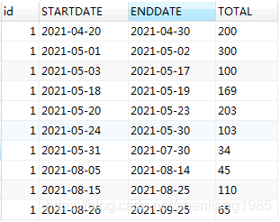 SEQ ID STARTDATE ENDDATE NUM 1 1 2021-04-20 2021-05-03 200 2 1 2021-05-01 2021-05-24 100 3 1 2021-05-18 2021-05-31 69 4 1 2021-05-20 2021-07-31 34
