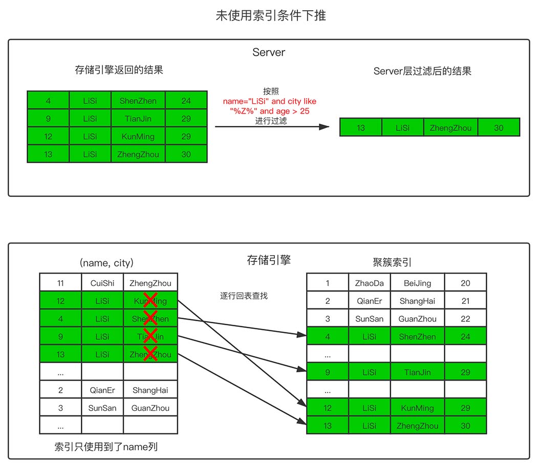 - 判斷WHERE條件部分能否用索引中的列來做檢查,條件不滿足,則處理下一行索引記錄;