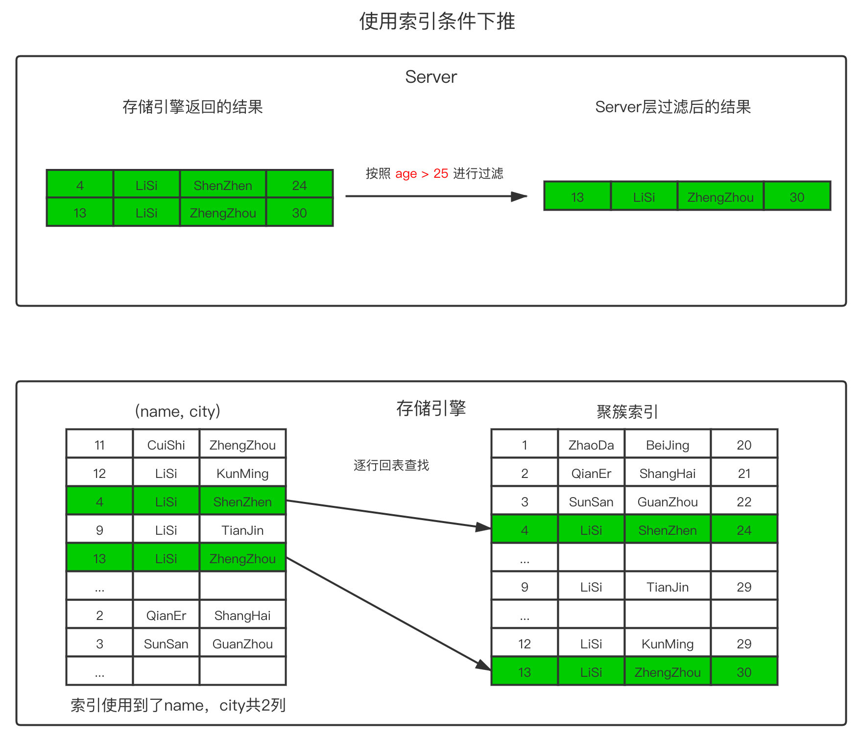 使用索引下推的情況下,執(zhí)行過程是這樣的: