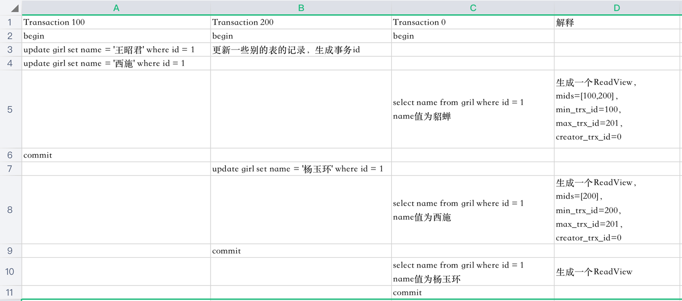 當(dāng)事務(wù)id為200的事務(wù)提交時,查詢得到的name列為楊玉環(huán)。