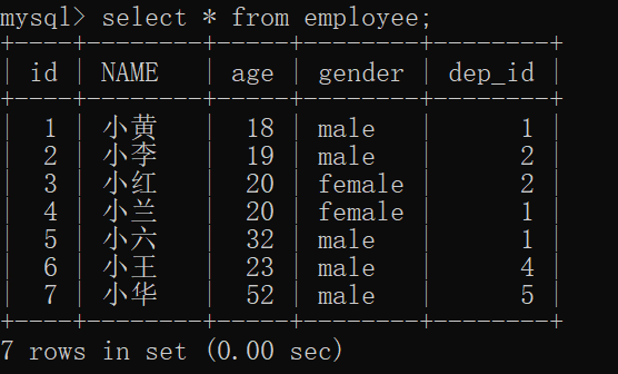 由于部門表中沒有id=5的部門,所以員工表dep_id=5的這條記錄沒有返回;而由于行政部沒有員工,所以這條記錄也沒返回。