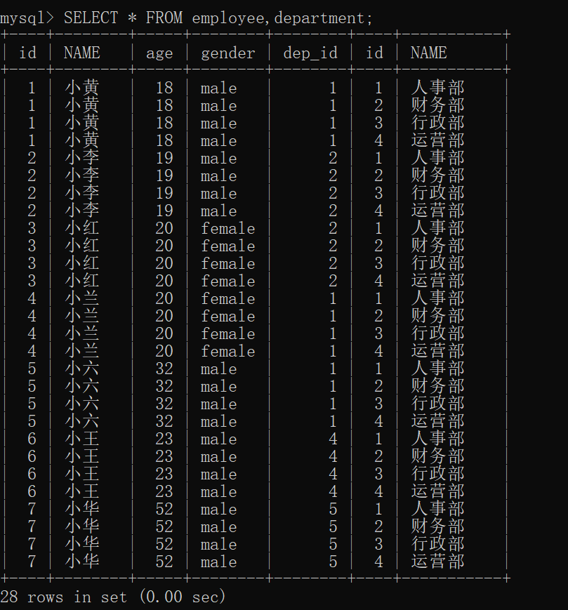 上述結(jié)果肯定不是我們想曉得的,左表中每一個人都有4個部門,仔細(xì)觀察這4條記錄,正好是左表每一條記錄和右表一一匹配后的結(jié)果。
