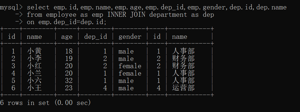 select emp.id,emp.name,emp.age,emp.dep_id,emp.gender,dep.id,dep.name from employee as emp INNER JOIN department as dep on emp.dep_id=dep.id;
