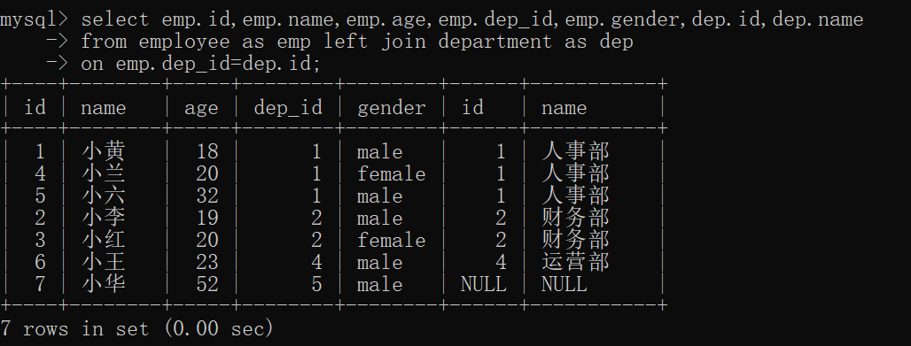 select emp.id,emp.name,emp.age,emp.dep_id,emp.gender,dep.id,dep.name from employee as emp left join department as dep on emp.dep_id=dep.id;