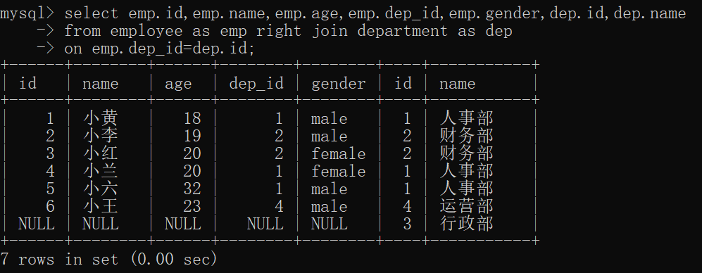 select emp.id,emp.name,emp.age,emp.dep_id,emp.gender,dep.id,dep.name from employee as emp right join department as dep on emp.dep_id=dep.id;